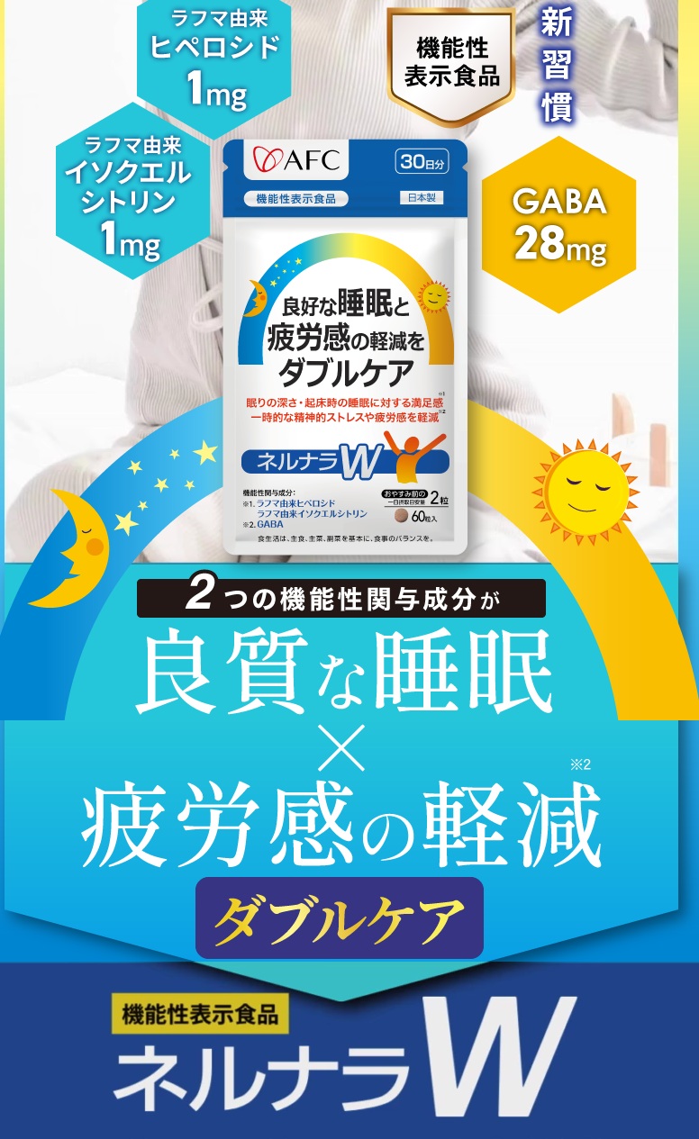 「睡眠の質を高めながら、疲労感までケアできる」──それを両立した画期的なサプリが、AFC社のネルナラW(ネルナラダブル)です。本製品は機能性表示食品(届出番号:H51)であり、科学的根拠に基づいて“眠りの質向上”と“疲労感の軽減”が確認されています。