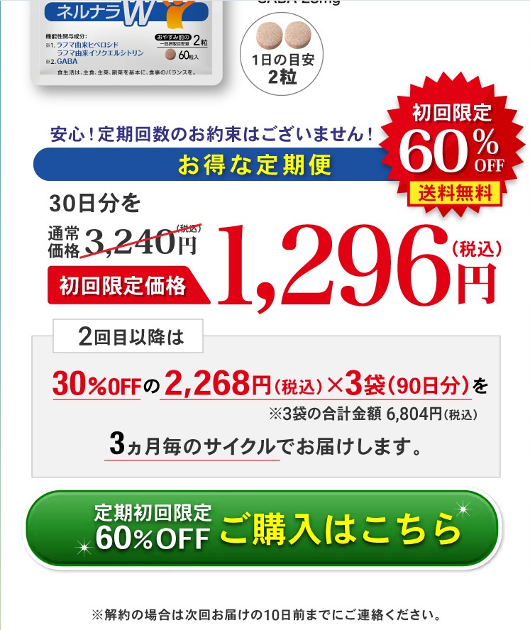 通常価格は2,980円(60粒入り・約30日分)。公式サイトでは初回限定で1,480円(税込)のキャンペーンがあり、回数縛りなしで試せます。1日2粒を目安に、就寝30分前の摂取が推奨されています。飲みやすい小粒タイプで続けやすく、男女問わず利用者が増えています。