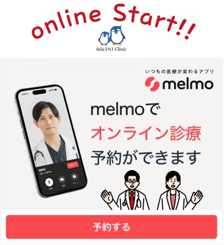 ※オンライン診療の対象は、花粉症の薬継続・舌下免疫療法の継続フォロー・睡眠時無呼吸症候群(CPAP)管理・軽微なのどの痛み・鼻炎のみです。